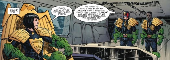 The way the story is visually structured made the weeks chapter speed by. The quick changes from the relaxed and controlled leadership of Chief Judge Hershey is well juxtaposed to Linus’s bombast intimidation and bombast well sets the scene for the coming confrontation. leadership It’s a moment you can see coming but would likely have been disappointed if no one posed the possibility of a trap once or like in this case twice. The action and talking heads montage contributed by Staz Johnson and Abigail Bulmer supports the narrative well. They deliver a near silent page that shows how the Sons of Booth score their laundry truck transports from the Judges themselves.
