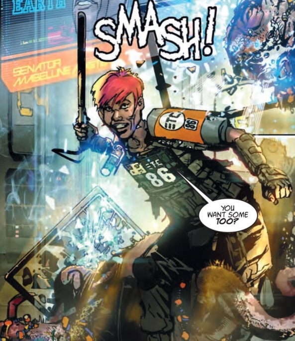 Tom Shapira: We’re seem to be back to the political front with a short spotlight on anti-alien politician, who we haven’t seen since (I believe) the first strip in the serial. Good, this is possibly the most interesting element in “Grey Area” right now, even if it is delivered with all the subtlety of a brick to face (forwardness has always been part of the charm of 2000AD. The problem is that after that bit we are back on the old treadmill with Bulliet talking about investigating the supposed deaths of his teammates while the powers that be plot around him. The serial is just treading water at this point – we’ve been here before and it feels like we’ll be here again.