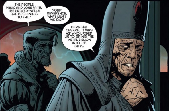 Karl Richardson’s character design has been a mix of the ornate and the unsettling. And here that fine work is both bathed in bleak shadow and drenched in crimson. At one point, Cardinal Cesare is framed dead center in the middle of the page. It’s a positioning that makes the villian as imposing as the title character, even though he’s a fraction of the size.