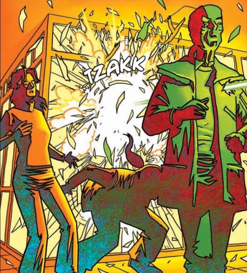 He does stick to his old tricks of showing action when a laser pistol goes off and everything is suddenly off color with a high contrast. The composition of the panel is actually pretty clever in how it hides who is shot. Our three characters form an arc around the center of the panel where the explosion is and De Ville adds an onomatopoeia on top of it for emphasis. The eye is immediately drawn to the center of the panel, for good reason that is where the explosion and action is. But drawing the eye in that way hides the fact someone got shot, a fact that is revealed quiet effectively in the following panels. That reveal and falling sequence is more effective because the reader doesn’t initially see it, but upon re inspection everything is clear and the creative team didn’t hide anything.