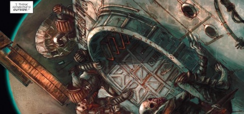 Michael Mazzacane: The first four pages of the new “Defoe” strip ‘The Divisor’ are excellent conceptually and largely work as comics. They just have a few hiccups to them. Compositionally they tend to follow the same rhythm of slowly revealing something horrifying at the bottom of the page, at the top everything looks normal but as the page progresses things begin to decay and the horrors show up. That patter is beautifully revealed in S.K. Moore’s art on the first page, a quasi-splash with little inset panels slowly getting bigger and revealing the mad Bishop at the helm of the spaceship. It comes through again on the fourth page as a man scribbles his thoughts on the spaceship design that came to him in a dream. The composition is well done contrasting the single large image of the ship with the increasingly tight paneling of the man and his notes. Tight paneling that eventually reveals a creeping zombie ready to devour him by the bottom of the page.