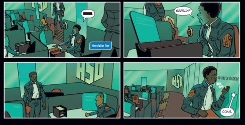Culbard’s art here is solid and handles busier scenes pretty well without making the whole comic feel overstuffed. I love the descending sequence from the satellite to the desks in the opening page, it echoes a scrawling Star Wars opening text yet the descent into the desks is a witty way to offset that. The character work and emotions are a bit of a mixed bag. The best example here might be Onofre, who’s standoffish look perfectly suits her character. However, a lot of the faces here, especially Weyowa’s, seem to have this otherworldly goldfish-like quality to them, which doesn’t help with the relatable, everyday dialogue that’s narrated to us. I do love Culbard’s attention to detail with countless ads in the backgrounds and fun little details that keep readers eyes’ busy, however.