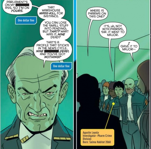 Rowan Grover: We finally see a little bit of authority come down on Bridget’s cavalier act in the latest installment of “Hate Box”. This kind of office banter is much more entertaining than the first few chapters, as we see the ‘charming’ personality of the Habitat’s Commissioner Fernan. Abnett uses the Hate Box well here as it even taxes Fernan every time he swears, which happens frequently enough to show readers how little this guy cares for making nice. Later on, having Bridget and Adriene discuss the events at the bar and the case of Bridget’s father’s death does a nice bit of relationship building between the two that I wouldn’t have expected earlier in the story. The interaction between them and the bartender through the Hate Box also makes for some nice narrative setting work, as well as light comedic relief to end the prog on.