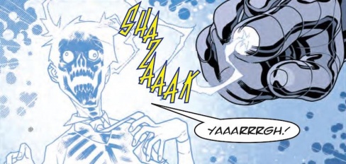 Greg Lincoln: Rob Williams created a pretty solid story with this first arc of “Hershey.” Dead to the world she’s proving to be dangerous to the network of ghost Judges and cabals put together by Judge Smiley. Though Falcoa seems to have a surprise or two in store for Hershey’s partner in revolution, Frank, she’s seems throughly un-phased by the “powers” he has be given by the encaladus energy as she stands him down in a one to new face off in this chapter. It’s a quick fight as she has one last surprise for him in store and it’s a thoroughly satisfying end that she delivers to his reign. Williams gets right to the heart of things with this chapter, he leaves no doubt that she succeeds in her “last mission” but leaves fully up in the air if it’s in fact her last. The final words about not knowing how she is to Frank leave us to wonder where her final journey will take her and if this is in fact the last we have seen of the Once Chief Judge taking her long walk of sorts.