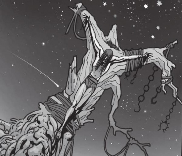 Michael Mazzacane: When we last left off with “Fiend” the creative team ended a riff on Le Carrie style espionage with quite the bang. A rocket to the house tends to do that sort of thing; it also blasts open the world of possibilities for how to begin the next strip. In all those possibilities a trip into the subconscious of Constanta for a talk with his patron, Balaur, while crucified to a tree was not one of them. It was such a tonal whiplash that I’d honestly thought I opened the wrong issues of 2000 AD. That reaction is perfectly in keeping with the dream logic of the opening pages of this strip.