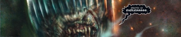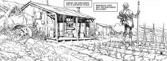 Things do not end well for Metta Lawson. The war for Badrock is over. And it’s not only that Abnett’s script shows how the town lost, it’s that the loss is shown to be minuscule compared the greater interstellar conflict that was borne from thos ashes. One war simply led to another – one that Lawson is not even invested enough to fight in. The loss of her town and the loss of so many friends has broken her; she’s left tending her garden and wandering the vast plain of headstones that Winslade shows spiraling away from the shack Lawson calls home. The markers of the dead are all around and extend out towards the arid hills. A closeup on her eyes show her own youth eroded away in wrinkles that look like lines etched into rock.