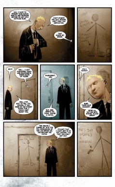 Ben Templesmith is an immensely talented artist, and while he’s forced to work quickly and in very uniform, smaller frames, in a way it seems to focus his talent for storytelling. While his work is highly stylized, it’s potently emotional work. His background in horror comics helps give Snowtown its character. To give “Fell” a dark, smoggy feeling like an inner city at night, Templesmith draws on gray paper using both dark and white inks. He inks and colors everything himself, using watercolors for much of the shading. You can watch a video of him inking and coloring a page of the long-awaited next issue of “Fell” with a live trip-hop DJ at the Noise Pop Festival 2011, and see him use beer to mix with the watercolors. It feels almost haunted–dark, murky, hollow.