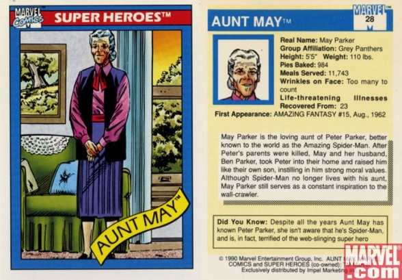 Why it’s the best (David Harper): In the first series, I loved the fight stats for all of the Marvel characters. Granted, I thought they were real (that’s another story entirely), but I really loved this card because for Aunt May they changed her stats to say things like “Pies Baked” or “Meals Served”. Looking at it now, it might not fly, but at the time, it was a hilarious twist to make. Still, I can’t help but be bothered by that pies baked number. How did Aunt May not eclipse 1,000 pies baked in 28 years of existence? It’s just not realistic.