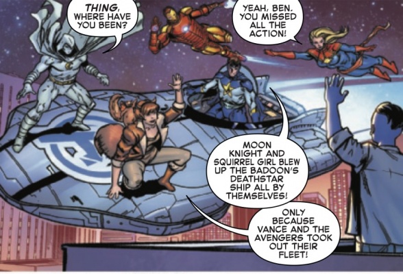 “Fantastic Four” #45: Wait, you mean we could have been reading about Squirrel Girl and Moon Knight teaming up to destroy a deathstar this whole time, and we were stuck following Reed “I’m too smart for you” Richards instead? Shame! – Robbie Pleasant