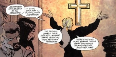 “Batman: The Cult”, written by Jim Starlin, beautifully drawn by Bernie Wrightson, and colored by Bill Wray, tells the story of Deacon Blackfire’s subjugation of Gotham City’s homeless and poor, his rise to power over the entire helpless city, and his eventual (obvious) downfall. The key to Blackfire’s character is that he gives Gotham’s hopeless something to believe in that isn’t immediately villainous or terrifying. It’s the classic tale of a snake oil salesman. He’s like a overtly religious Lyle Lanley trying to sell Gotham City a monorail to heaven. Blackfire promised (and delivered) things that they never had before, all under the guise of something good and righteous. That’s power that someone like the Falcone gang needs money and muscle to buy. Blackfire only needs believers and goodwill.