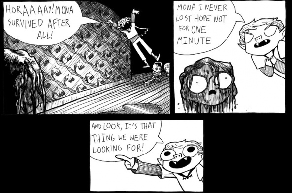 Artists Abby Howard’s style is consistent throughout the first book as it juxtaposes emotive cartooned figure work with line heavy environments. The dichotomy between the two styles is the source of the comics humor and heart. it is her ability to balance/mash up and find comedy in the grotesque horror of the series that keeps things feeling fresh. You’d think after 100+ pages the twee emotive cartoon style juxtaposed against the heavy lining and gorey imagery, reminiscent of EC Comics, would run out of charm. It does not with consistent progression and new elements. While some moments are undoubtedly more outwardly funny than others, Howard’s comedy seems to be the best when they let the juxtaposition do all the talking and moments are played a bit dry.