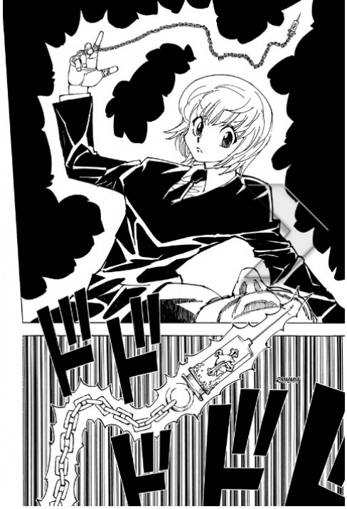The lead protagonist of the series, Gon, is nowhere in sight. Instead, the chapter focuses on blonde haired boy, presumably one of the 14 children of the King. The boy is in possession of a gauntlet bearing chain linked needles, which seemingly have the ability to steal the “Nen” abilities of others. Said abilities include the power to possess animals smaller than a hamster. That’s pretty kooky, right? Meanwhile there’s a weird little frankenstein spider teddy bears that crawl inside of individuals and possesses them? I don’t know what I’m reading, but I like it.