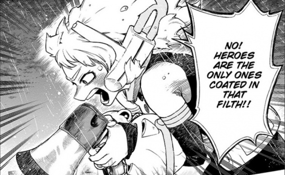 Kohei Horikoshi accomplishes this by seamlessly weaving a dramatic speech and her own flashbacks together, connected by internal narration. It all builds up to a dramatic yet cathartic moment (which will be a spoiler for a key moment as I discuss it).