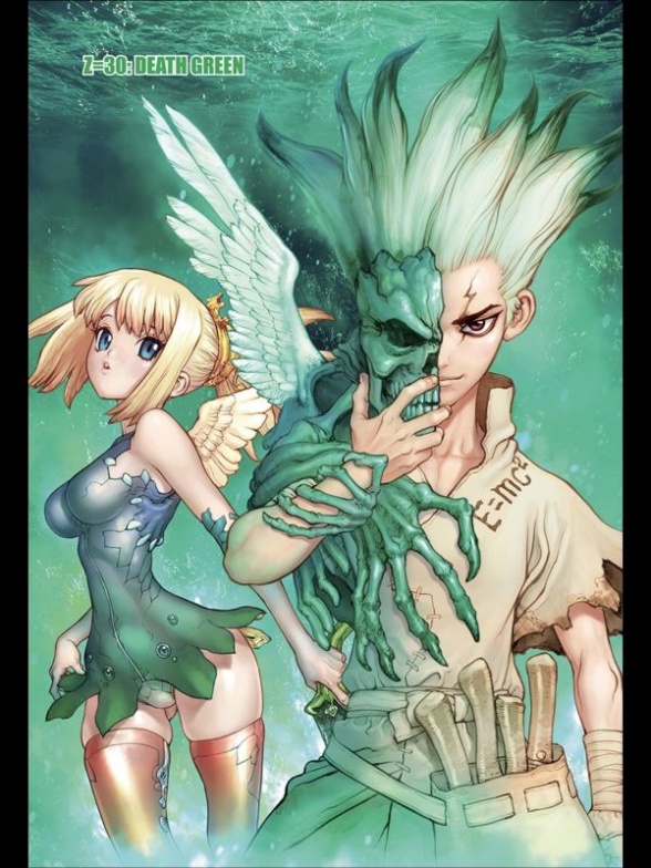 Their journey starts with Senku giving Ginro a silver tipped spear which isn’t just out of the kindness of his heart but, as usual, an opportunity for a science lesson. Silver, Senku states, reacts with the toxic gas emitted by Sulphuric Acid by turning black. That particular Chekhov’s Gun goes off when they stumble across a great green lake; seen as beautiful and serene at first until Senku points out the spear, and they realize that one step closer and they’d all be overcome by the fumes and die. Still, they need to collect a sample, so before they head back to retrieve the acid, Senku ends the chapter by dramatically stating his intentions to teach Chrome everything he knows about the history of science, which seems both absurdly over dramatic, but also lends the proper weight to the danger they may face on their expedition.