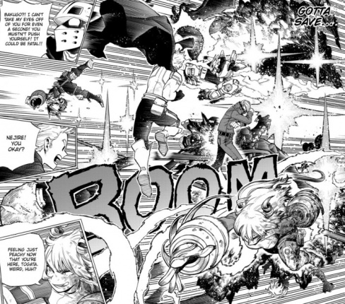 As the last chapter ended with a surprise return of a fan-favorite who’d previously been benched, this chapter begins by explaining how it happened. While the “how” is something readers have all expected, and were in fact anticipating, the timing couldn’t be better for a gloriously dramatic return. Yet that’s only the first of many dramatic moments, as we also see Bakugo and Nejire make dramatic rescues in spite of their own wounds. Suffice to say, it’s very dramatic, and Horikoshi’s artwork continues to shine with a two-page spread showing their heroic attacks in glirous detail and a multitude of action lines.