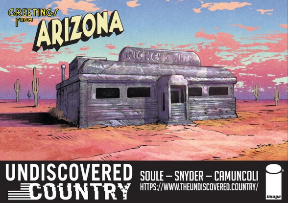 “Undiscovered Country,” Scott Snyder, Charles Soule, and Giuseppe Camuncoli’s half dystopian/half way too prescient sci-fi story is releasing its second collection, ‘Unity,’ next week. Its thirteenth issue, which kicks off the third arc, drops in June, but before that, Image has sent out five postcards to various comics websites, to tease and preview some of what may be coming for the series down the road.