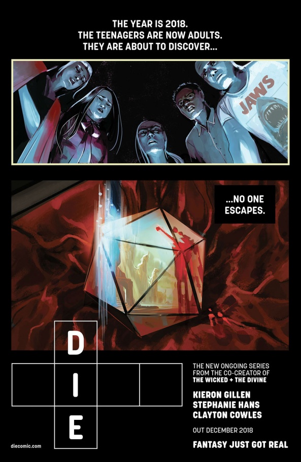 Gillen also said he has designed a completely new role-playing game, and that some version of the game would be available with the first trade and in the backmatter of issues after the first arc. “DIE” #1 will be out in December from Image Comics. You can check out a look at the teaser for the series and the cover for issue #1 below.
