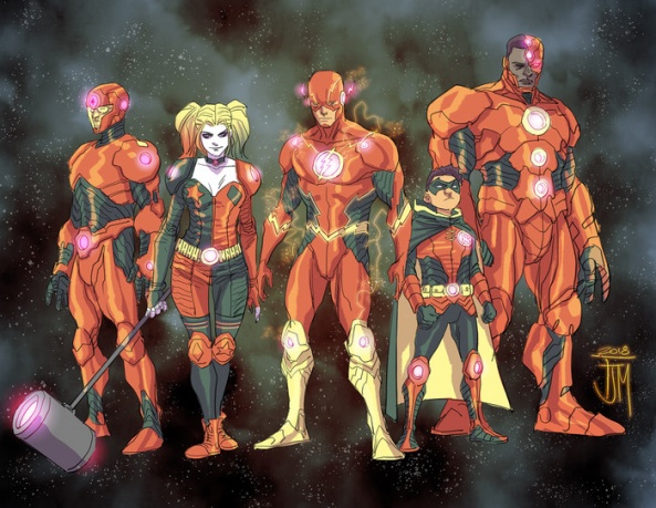 And finally, Team Wisdom made up of Flash, Cyborg, the Atom, Harley Quinn, and Damian Wayne’s Robin: