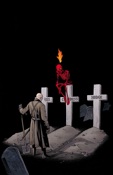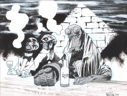 — James Harren has been drawing Hellboy drinking with skeletons.