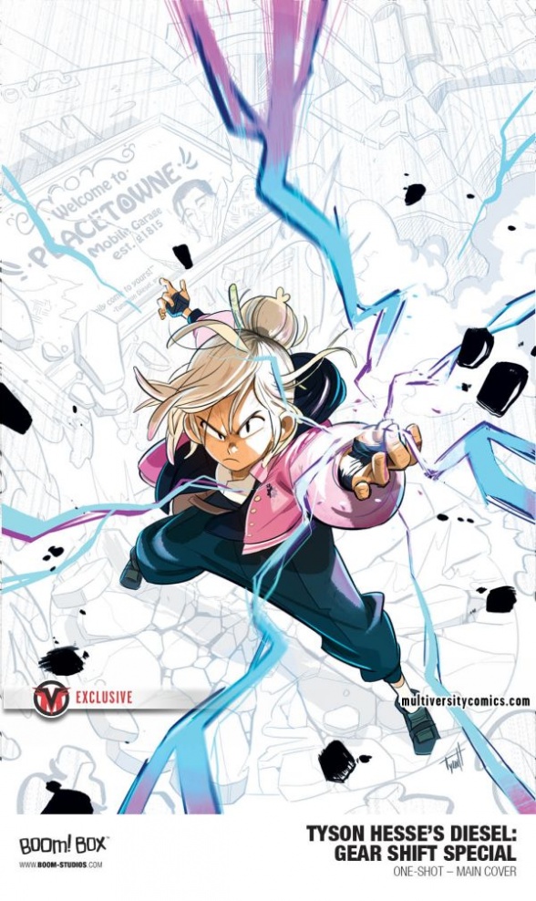 We were big fans of “Diesel” when it was originally coming out in singles (now collected as “Diesel: Ignition“), and just over two years later, Hesse is following it up with “Diesel: Gear Shift Special,” a one-shot, due in October. We are thrilled to exclusively reveal the title, as well as the solicitation and cover image to the new BOOM! Box one-shot, as part of BOOM!’s “Road to San Diego: Ten Announcements in Ten Days” promotion.