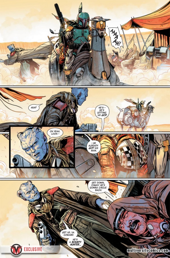 Since Lucasfilm rebooted the Star Wars Expanded Universe in 2014, Boba Fett has undoubtedly been one of the most marginalized characters in the new canon – the fearsome bounty hunter, whose Mandalorian armor inspired a wave of devotion from fans to the galactic subculture, isn’t even canonically Mandalorian anymore. Still, Marvel have been giving the character his due, revealing he was responsible for informing Darth Vader of his son’s existence in their 2015 relaunch of the comics, and now with next week’s “Age of Rebellion” one-shot, which we are proud to present an exclusive preview of.