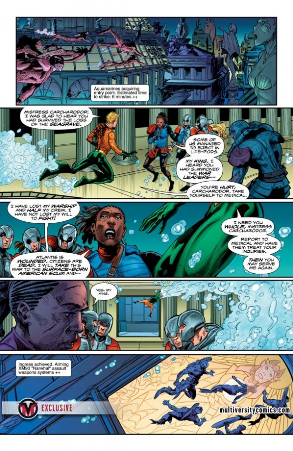 “THE DELUGE” part three! No sooner has Aquaman found a lead on the location of N.E.M.O.’s secret headquarters than the United States sends a team of aquatically trained super-soldiers to take out the sea king. Behold America’s Aquamarines!