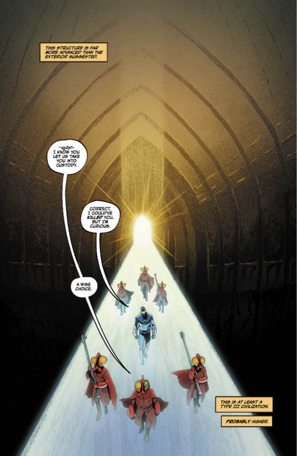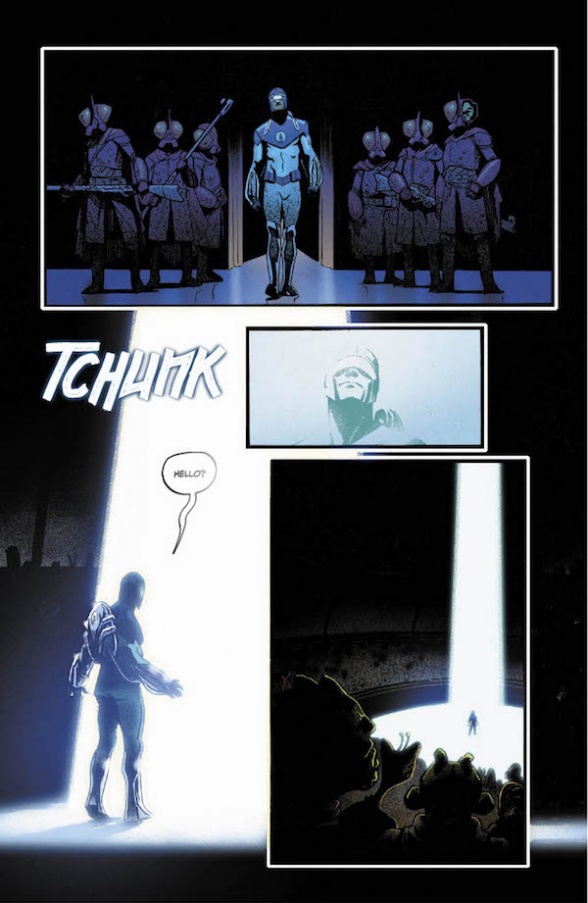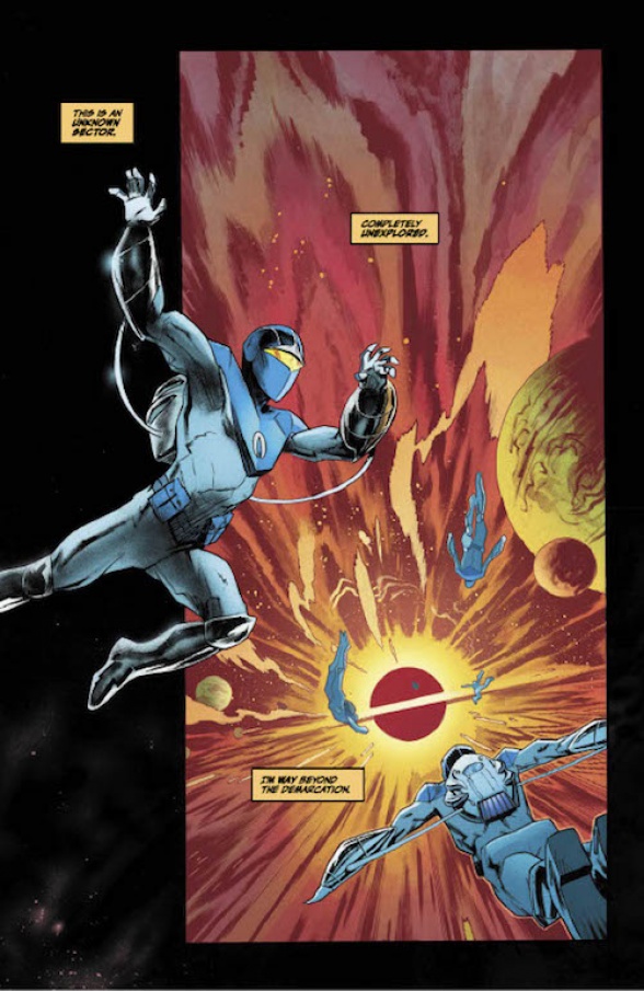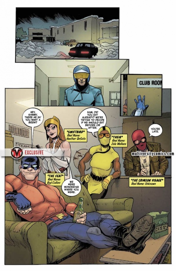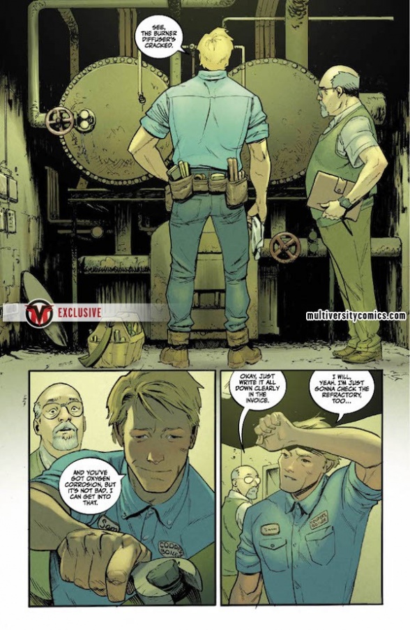 Christopher Cantwell and Adam Gorham’s mysterious new superhero series, “The Blue Flame,” debuts at Vault Comics tomorrow, and we pleased to present an extended preview of the first issue, with an exclusive additional six pages that give us a first look at cosmic hero Sam Brausman’s unusually blue collar double life.