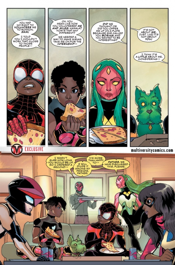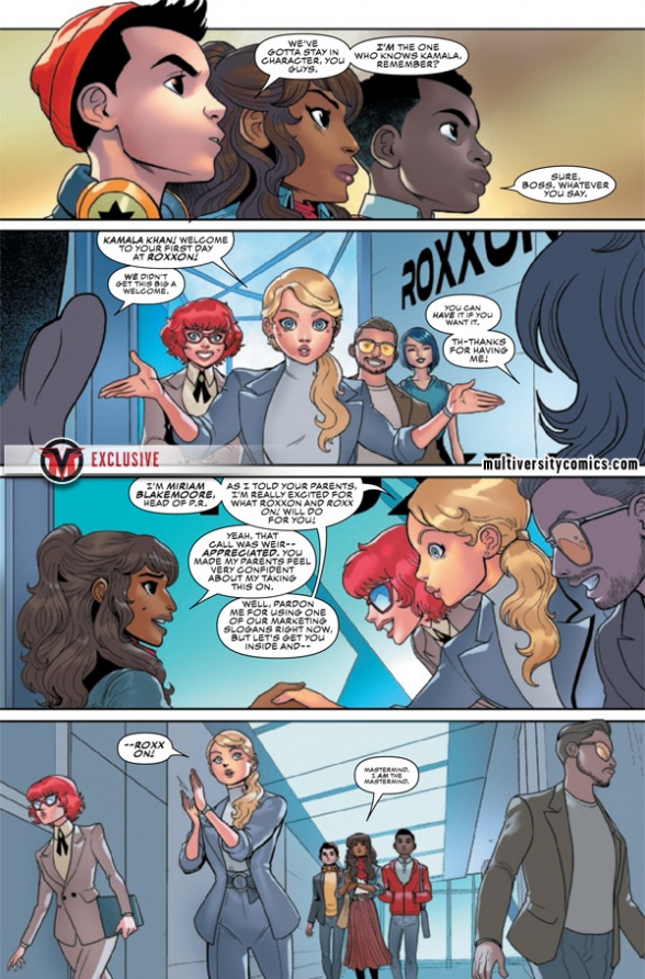 Danny Lore and Luciano Vecchio’s colorful “Champions” has got off to a fun start, with Miles Morales/Spider-Man and Sam Alexander/Nova going undercover at the diabolical Roxxon Corporation, which is trying to reinvent itself as a hip social media company for young people. We are pleased to present an exclusive preview of next week’s issue #8, which sees them being joined by none other than Kamala Khan/Ms. Marvel.