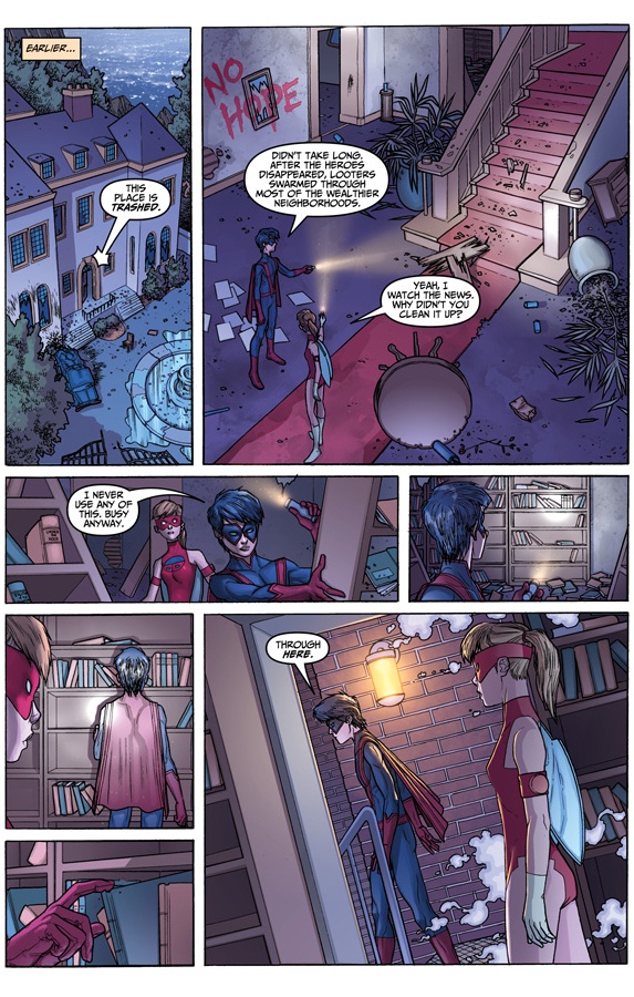 Man, did you read the last issue? It was like “Teen Titans” meets “Lord of the Flies!” “Danger Club,” a venture by the same team that brought you “Supergirl: Adventures in the 8th Grade” (seriously) packed a punch in the first issue, pitting their teen heroes in a fight to the death after all the adult heroes went off to take on some catastrophe in space to never return. As you can see in the following pages, they took it to a whole new level, and it seems that our hero from the first issue, Kid Vigilante, has a whole new set of challenges to overcome.