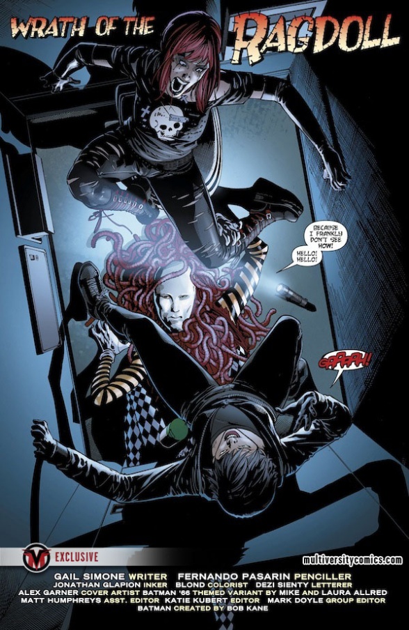 This morning, from the fine folks at DC Comics, we have an exclusive five page preview of “Batgirl” #31, due out on Wednesday, May 14th. Of special note is the gorgeous Mike Allred “Batman ’66” variant cover, featuring Yvonne Craig as Batgirl from the classic show. The issue also features the return of Ragdoll, the Peter Merkel version of which was co-created by Simone, and featured prominently in her “Secret Six” run.