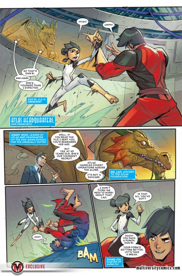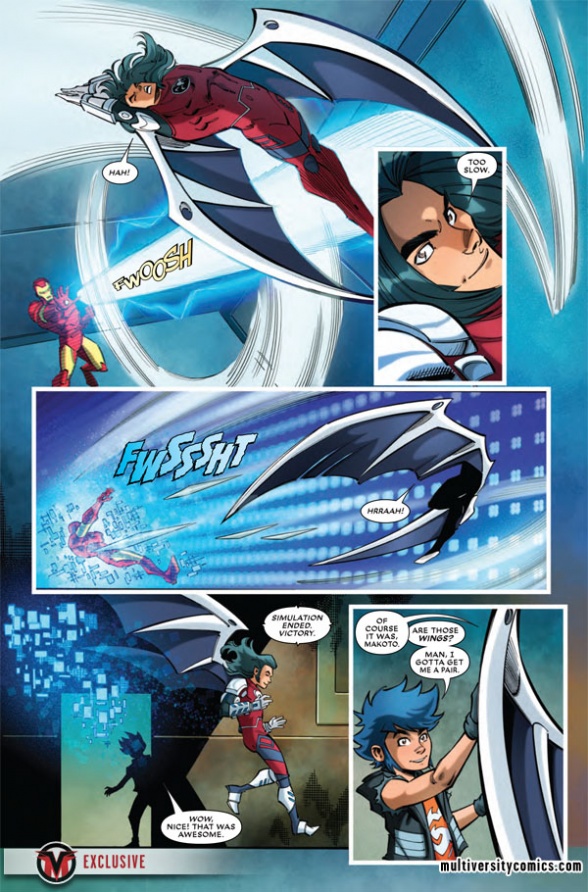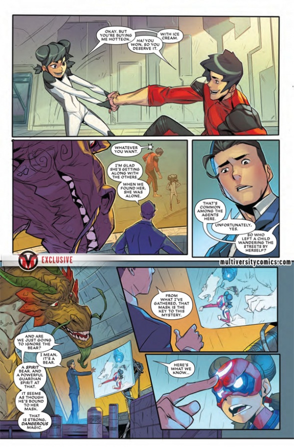 This month, writer Alyssa Wong and Marvel have been expanding the Korean corner of the Marvel Universe with the “Future Fight Firsts” one-shots, starring the Agents of Atlas characters created for the mobile game Marvel Future Fight who haven’t headlined their own comic books. We are proud to present an exclusive sneak peek of next week’s third and final issue, starring Crescent and Io, as well as the back-up story starring the Future Avengers of Japan.