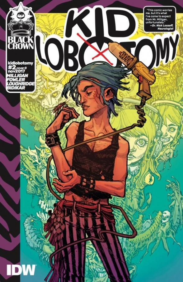 “Kid Lobotomy” is the sounding gun for Black Crown, Shelly Bond’s new imprint at IDW. The first issue impressed our own John Schaidler, and we are thrilled to bring you an exclusive preview of the second issue, which drops on November 8th. The series, by Peter Milligan and Tess Fowler, was described in the initial solicitation as “Kafka meets King Lear by way of Young Frankenstein, while dealing with music, shapeshifting, memory, and more. It’s an inventive and gripping book, and we can’t wait to see where it’s going.