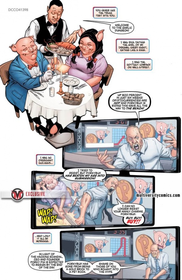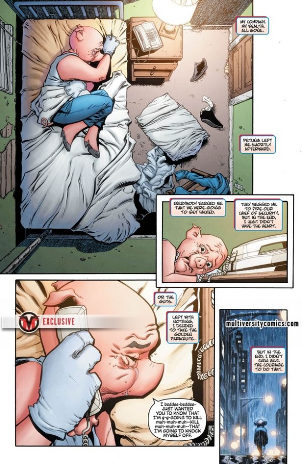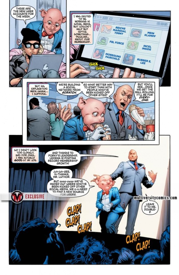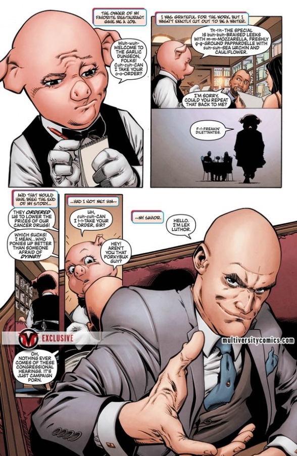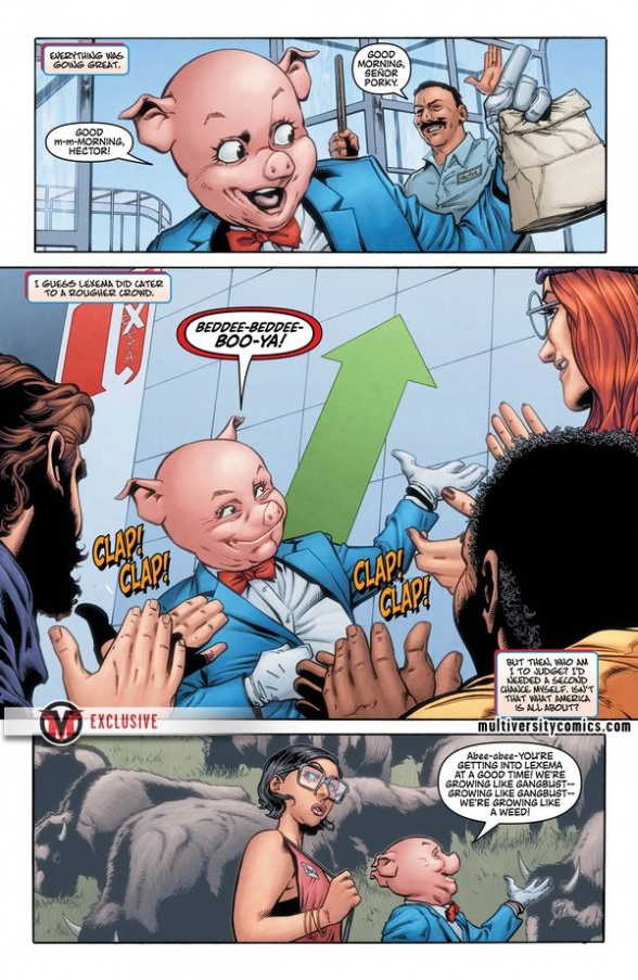 Lettered by ALW’s Troy ‘N’ D-D-DaveFacing financial and personal ruin, a desperate Porky Pig applies for and gets an entry-level position with LexCorp. Grateful to his new benefactor, Porky becomes Luthor’s most loyal employee and defender. But when a major scandal breaks in the news and Lex is called before a Congressional Committee, guess who is about to be offered up as the sacrificial pig?