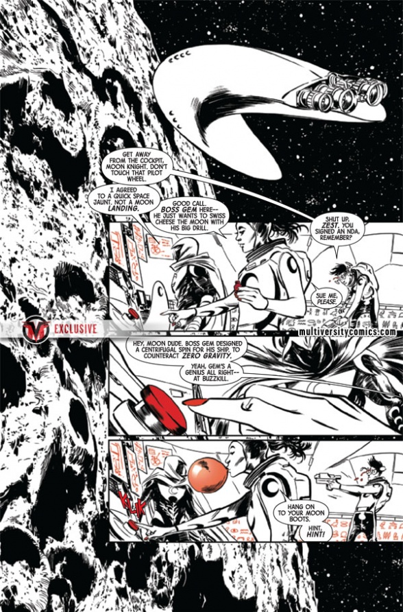 Multiversity Comics are pleased to present an exclusive preview of next week’s “Moon Knight: Black, White & Blood” #3, the latest installment of Marvel’s black, white, and red anthologies starring some of the company’s more violent characters. Our six-page preview features the first pages of stories from Erica Schultz and David Lopez; Jim Zub and Djibril Morissette-Phan; and Ann Nocenti and Stefano Raffaele.