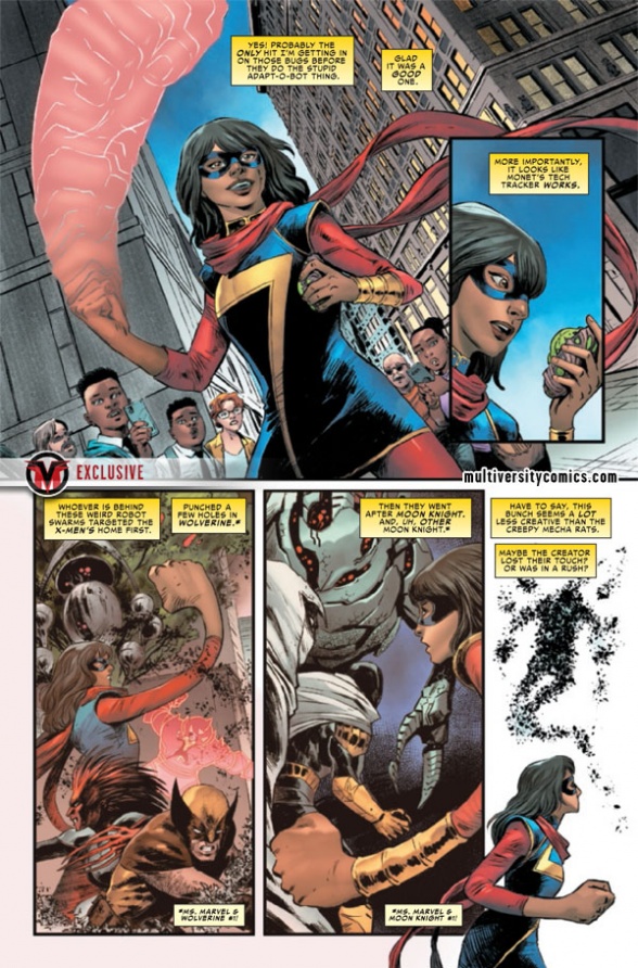 Lettered by VC’s Cory PetitDeadly symbiosis! Venom is on the hunt… but who is hunting Venom?! Ms. Marvel teams up with Dylan Brock, the new wicked web-slinger on the block, as a scheme to harness the symbiote rears its ugly head! The first Venom/Ms. Marvel partnership is also the concluding movement of the super hero symphony of the summer, as we reveal the connection between Wolverine, Moon Knight and Venom, and Kamala Khan’s team-up uncovers the larger plot behind it all — you’re not going to believe who’s pulling the strings!