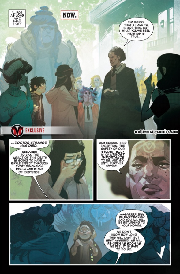 With the ‘Death of Doctor Strange,’ it had to be asked: what would be the impact on the school Stephen founded, Strange Academy? Fortunately, the school’s co-creator, Skottie Young, will explore that in next month’s tie-in with artist Mike Del Mundo, and we are pleased to present an exclusive five-page preview.