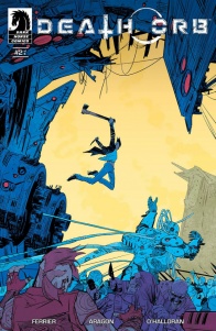 Despite the gore and drama, Ferrier’s not afraid to have a little fun in this book. Whether it’s a wordless panel of Rider’s smirking face right before he throws himself into the fray or a string of graphic threats from Aleeya, these little moments help contrast Father’s lofty monologues and the urgency of Rider’s quest. Rider’s grim sense of humor continues to come out in issue #2, and adding a little personality to the team’s lanky, head-choppin’ hero is a good choice. Overall, “Death Orb” reads like a nifty love letter to a wide array of comics, movies, and other media Gen-Xers grew up with, from Conan and The Road Warrior to 2000 AD and Grendel. What sets it apart from its current peers is its solid craft.