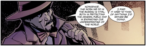 And here, what’s really emphasized is that Hellboy and Archie are co-workers. And we see Hellboy find a problem, manage it quickly, and deal with it relatively easily. Mystery and tension are present, but purposefully downplayed. This is a story about three people at work doing their job and being effective at it. Yeah, it’s a slightly more eventful day than usual, but it’s just another day on the job.
