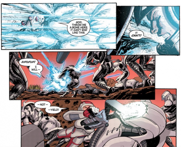 Her suspicion towards aliens is touched on when she gets demoted from squad leader by her jerk of a lieutenant, which her comrade Sergeant “Donkey” (no, really) recognizes is because she’s the granddaughter of the general who surrendered to the turians; however, she brushes it off, asking if “Donk” is flirting with her. Similarly, Ash tells Rasa she isn’t sure she deserved to be rescued by Shepard and Alenko, but that’s all she can say before she’s cleared for duty. And why would Rasa ask her anything more in-depth? This is a comic about how Ash is a badass geth killer who takes everything in her stride; and that’s sadly all it is.