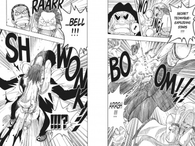 Oda certainly knows how to set a scene and, even more, a fight sequence. In the same vein as the particularly well choreographed battle between Buggy and Luffy, Oda plays Kuro’s skills against Luffy in a manner that is exceptionally dynamic. The opening pages in which Luffy stretches out in order to slingshot into Kuro, only to be twisted and dodged, is elegantly portrayed. The sequence only becomes more exciting as Kuro dodges a punch, only to land perfectly on Luffy’s outstretched arm. He then runs the length of Luffy’s arm to kick him squarely in his rubbery face. Kuro’s speed and cunning is less interesting than Luffy’s gum gum abilities at face value, but the way Oda turns Luffy’s power against him his quite enjoyable.