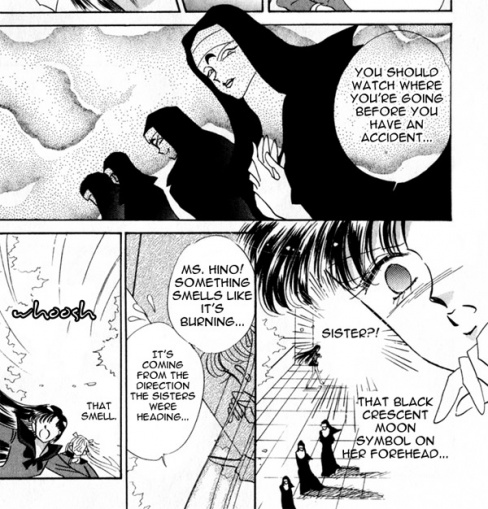 They’re also much creepier than Beryl’s archaic army, traversing Tokyo in a flying saucer, while their droids infiltrate the city disguised as normal people, allowing the story to tap into the decade’s paranoid obsession with UFOs, crop circles, and alien abductions. The upside down black crescents on their foreheads bring to mind religious adornments, a parallel made explicit by a scene where their droids disguise themselves as nuns, as well as their attempts to recruit followers — some slight social commentary is also provided from the way the Clan tries to paint the Sailor Guardians as a threat, and turn people against them.