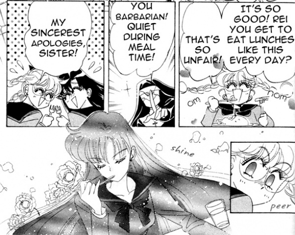 At least Rei/Mars one ups Ami by responding to a Shakespeare quote with a Francis Bacon one, reminding her “to spend too much time in studies is sloth.” (Usagi and Mina, meanwhile, wonder what kind of bacon Rei is eating.)