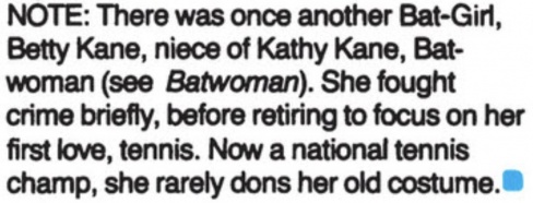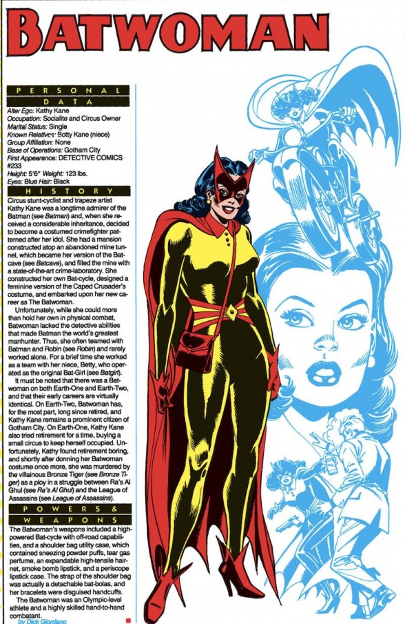 Batwoman: It must be noted that there was a Batwoman on both Earth-One and Earth-Two, and that their early careers are almost identical. On Earth-One, Kathy also tried retirement for a time, buying a small circus to keep herself occupied.