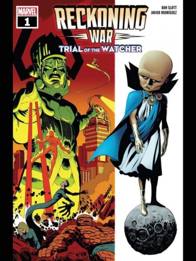 Javier Rodriguez’s art is the key element to this story feeling like the golden age due to the thick line and bright coloring during the What If… part of the story. It does not have this darker element that newer modern Marvel stories have that keeps the reader engaged because it feels refreshing and fun. It’s another balancing act as Rodriguez pays homage to Jack Kirby’s work from the past but adds current elements such as more detailed expressive looks on the characters when they are battling Galactus. Rodriguez also creates this interesting courtroom in that Ikor takes Uatu where there are giant-size versions of Marvel characters from the What If… storylines of the past, such as Spider Man joining The FF and Silver Surfer with the infinity gauntlet.