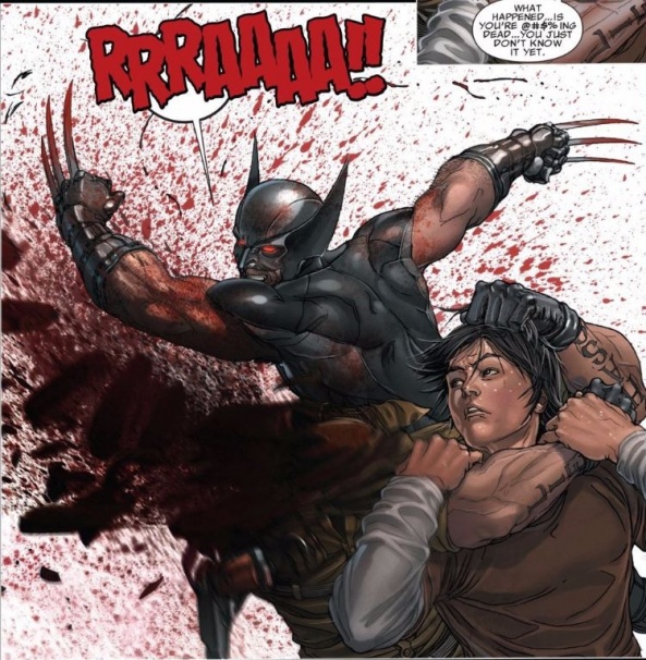 ‘Leper’ also sees the return of Clayton Crain to art duties. As previously discussed his and Mike Choi-Sonia Oback’s art styles are capable of different things, those differences become extremely apparent in the back half as it relates to the treatment of violence by the art teams. During my discussion of “Angels & Demons” I noted how Crain’s art primarily showed violence by its after images, the viscera and piles of bodies. As Angel and Laura are caught up in one of the mutant explosions in issue #12, the double page spread is awash with colors their figures standing out as their detail contrasts with the nondescript melting or vaporizing civilians. Once the squad return to the present and Choi-Obak take over art duties, violence becomes explicit and a parodic with the level of blood. Such as when Wolverine turns some anonymous henchmen’s toroso/being into a read mist with a single stroke – in another “Fist of the North Star” reference. It’s honestly surprising this got published by Marvel considering how they treat violence in a very PG-13 manner. Fights can have all the intense choreography and bone crunching audio, as long as they don’t get wet. Choie and Oback put the wet in the teams “wetwork.”