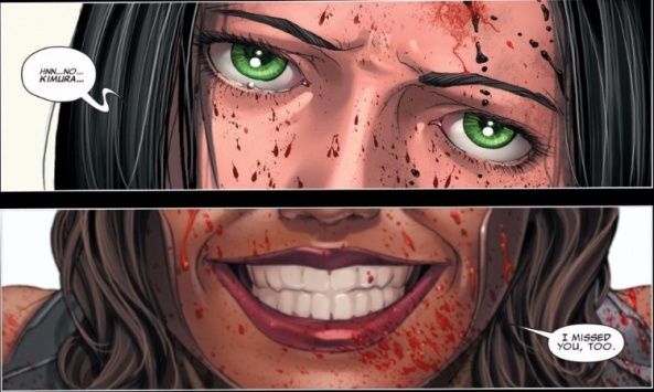The use and portrayal of violence is more effective once the book segues into the kidnapping and rescue of Laura Kinney from the Facility. The sadistic Kimura dissects Laura with a chainsaw giving the readers a horrifying single page splash of Laura strung up by one arm, her other cut off below the shoulder. This three page sequence, which begins on an even more horrifying 5 panel page that echoes exquisite corpse art as deep panel gutters bisect Laura and Kimura, rearranging them into a composite figure. The use of violence and gore here is worth purpose this time, as opposed to hollow shock value, it is the medium to show the viewer how Kimura views Laura Kinney, or the variations of X-23 she continually calls her. The horror of the moment also helps due to the presence of Agent Alisande Morales, as she discovers the true origins of Laura and gets a job offer. Despite being a SHIELD/HAMMER member, even this shocks her. Morales provides a normal quasi-straight man perspective to this wildness as the comic turns into a mad science/slasher story.