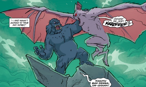 Mark: That moment really worked for me too. In part, I think it’s because once Un-Gaaah comes back, we know where the story is going. The story doesn’t have any surprises to pull on us—Un Gaaah is going to beat up Vesperra and win, we all know it. So having Hellboy tell it to us adds a different energy. It allows us to revel in this punch-up between monsters like little kids. And it works because the series is called Young Hellboy, and this moment captures the ideas associated with that title really well.