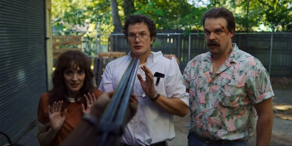 They arrive at Bauman’s home after Jim commandeers a car at a 7-Eleven, and the conspiracy theorist is none too pleased that they brought an enemy of the state to his property, greeting them with a shotgun. Bauman and Alexei trade barbs, and Hopper unsuccessfully tries to defuse the situation, forcing Joyce to yell at Bauman that it’s been a long day, and to “stop behaving like a jackass.” It must’ve been very cathartic for her, especially after Hopper’s constant whining.